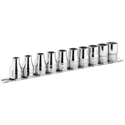 The Facom S series socket set has a drive size of 1/2 inch. It is supplied on a mettalic rack.