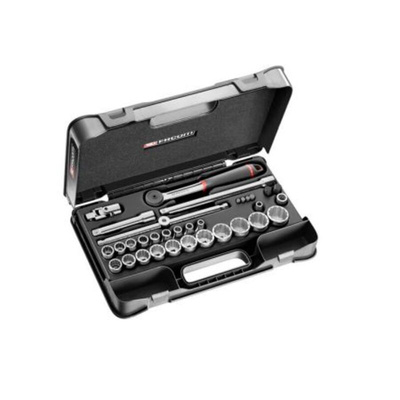 The Facom 12 point socket set includes ratchet, sockets, extension, universal joint, sliding handle, socket bit holder and bits.