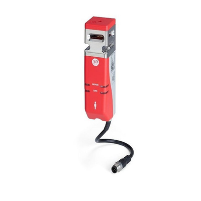 The Allen Bradley 440G-MZ guard master guard locking switch locks a guard door in the closed position and does not release it until the hazardous machine functions that are covered by the guard are in a safe condition. The safety control system only allows the hazardous machine functions to operate when the guard is closed and locked.