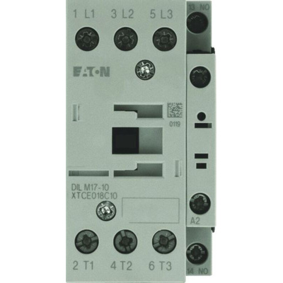 The Eaton series DILM is a 3 pole contactor that comes with 1 NC, AC operation and spring loaded terminals. Suitable for motors with efficiency class IE3. This contactor have auxiliary current, coil, and main current terminals with spring-cage connection technology. The DILM contactor series is characterized by its compact dimensions.