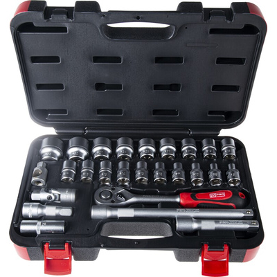 RS Pro professional Chrome Vanadium Steel 1/2 inch ratchet wrench and socket set in square drive which includes 19 sockets ranging from 8 to 32 mm. It has other accessories such as extension bar and universal joint to help you get into difficult areas. All components are manufactured from a chrome vanadium steel with satin chrome. This socket set is supplied in a handy easy to carry storage case made from durable hard plastic. The set can be used for most tasks especially building or repairing various objects including automobile repairs and is a perfect kit for professionals or enthusiasts.